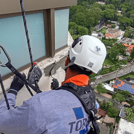 O método de acesso por cordas elimina a necessidade de estruturas pesadas como andaimes, reduzindo custos e acelerando o prazo de execução.